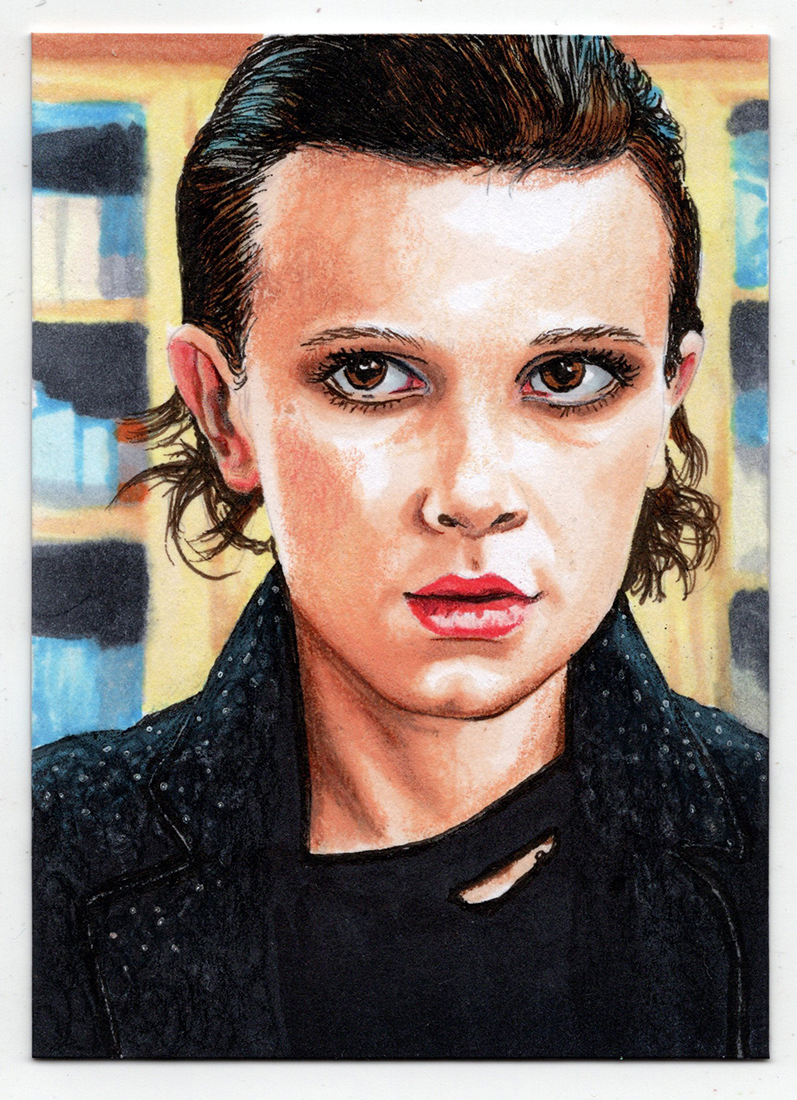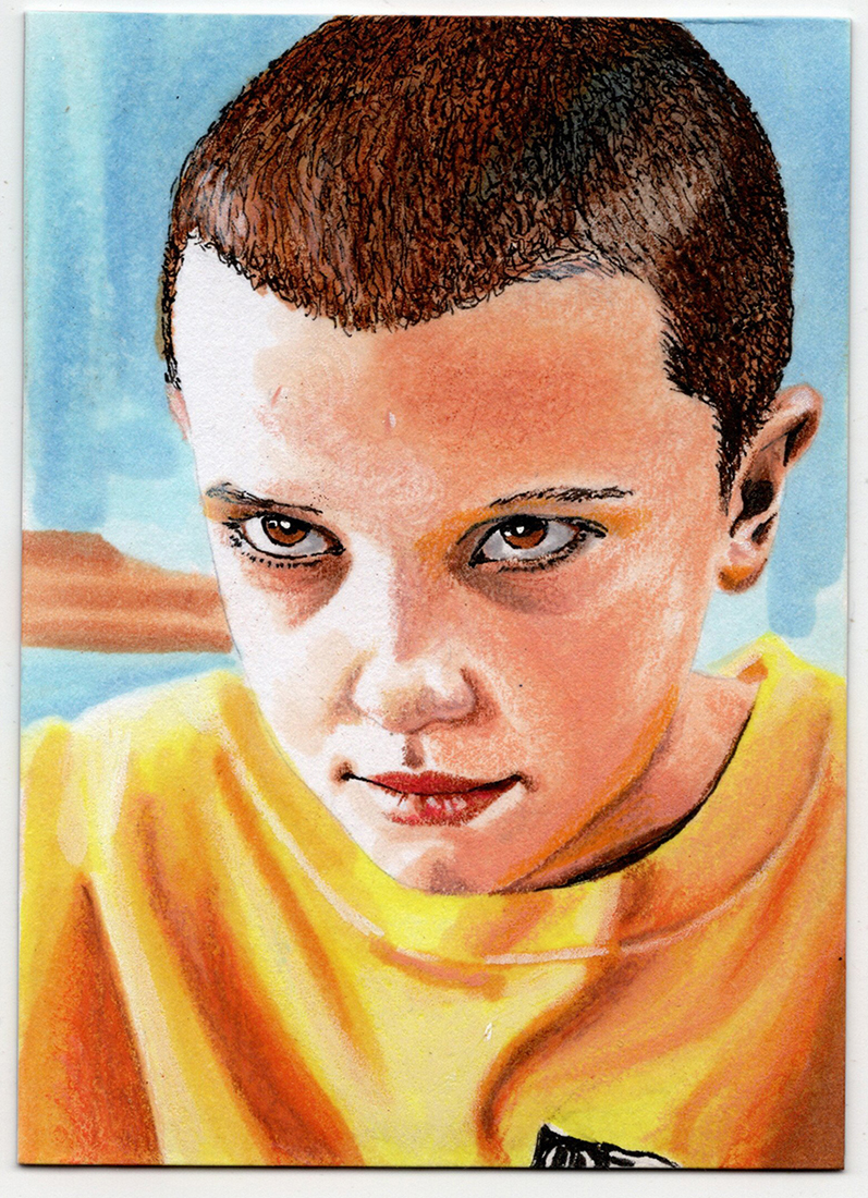 Traditional illustration produced on either 5 X 4 inch precut blank card stock or final cut 2.5 X 3.5 inch standard trading card. Illustrations are produced primarily with markers and colored pencils.