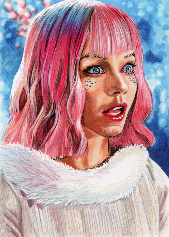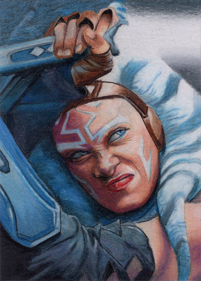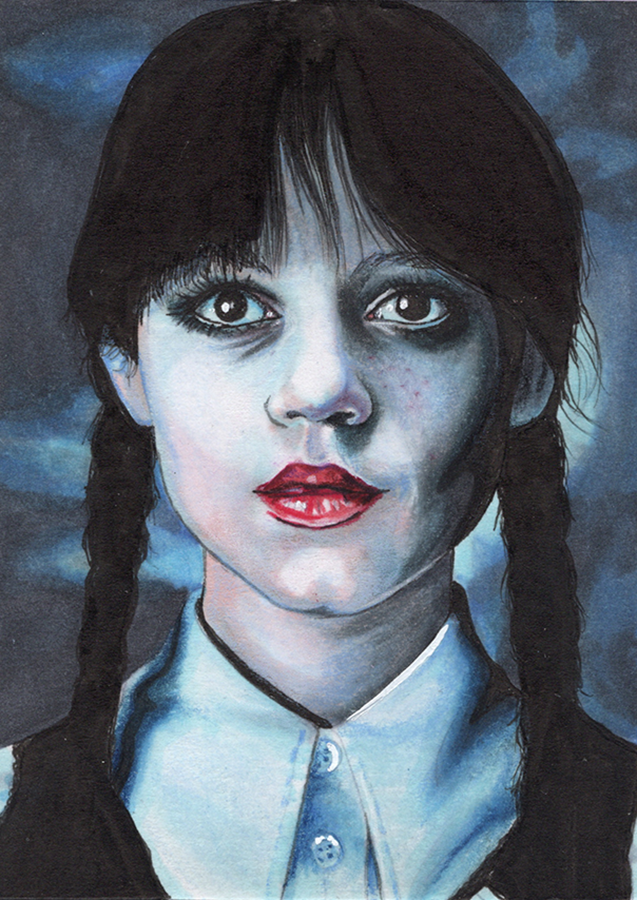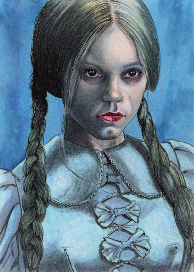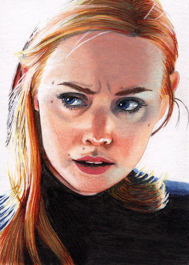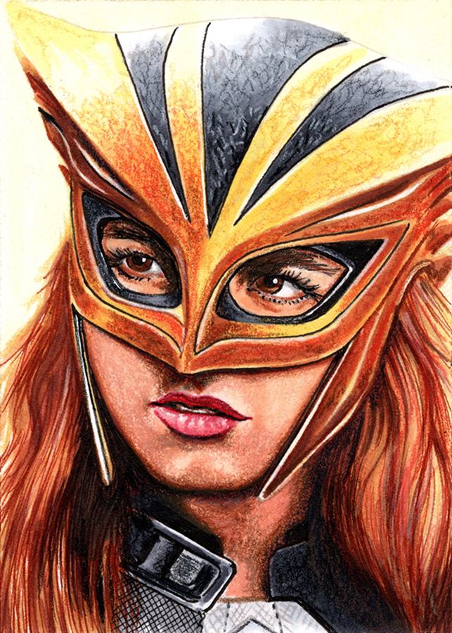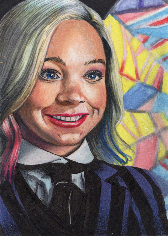 Traditional illustration produced on a standard 2.5 X 3.5 inch trading card. Illustration will be produced primarily with Copic markers and colored pencils.